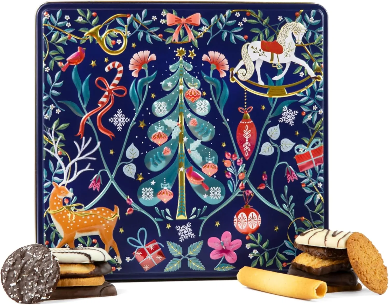 - Beautifully Embossed Christmas Biscuit Tins: A delicately embossed biscuits gift set tin with navy and gold details, filled with delicious assorted Belgian chocolate biscuits – a beautiful tin of biscuits to display in your kitchen or as Christmas decor