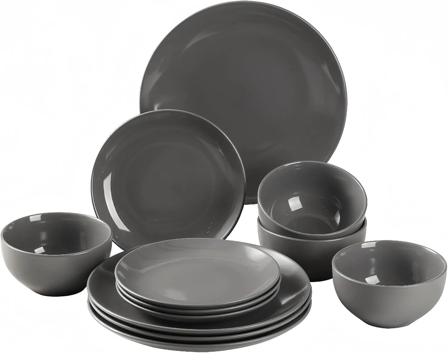 simpa 12PC Grey Glazed Ceramic Stoneware Dinner Set. 4 Dinner Plates, 4 Side Plates & 4 Bowls. Dishwasher & Microwave Safe.